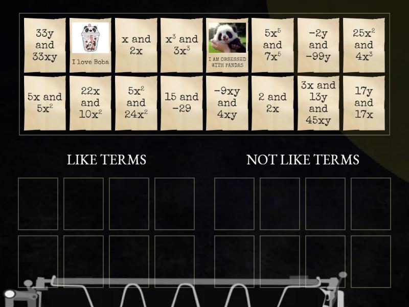 LIKE TERMS: x and 2x, 5x2 and 24x2, 15 and -29, -9xy and 4xy, 5x5 and 7x5, -2y and -99y, x3 and 3x3, I AM OBSESSED WITH PANDAS , NOT LIKE TERMS: 33y and 33xy, 25x2 and 4x3, 22x and 10x2, 3x and 13y and 45xy, 2 and 2x , 17y and 17x , 5x and 5x2, I love Boba ,