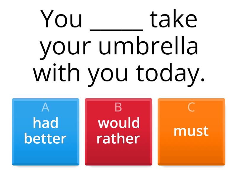 1) You _____ take your umbrella with you today. a) had better b) would rather c) must 2) I`d better (not buy) this dress. It doesn`t suit me. a) not buy b) not buying c) not to buy 3) We had better (book) a table. a) book b) booking c) to book 4) I`d rather Alex (not go) to the party yesterday. a) didn`t go b) not go c) hadn`t gone 5) I`d rather you (not tidy) this room. I`ll do it soon. a) didn`t tidy b) hadn`t tidy c) not tidy 6) Sam studied Physics at university, but he says he would rather (study) Linguistics. a) have studied b) studied c) study 7) I`d rather Sally (go) to art school. a) goes b) went c) had gone 8) I _____ better leave now. a) rather b) had c) would