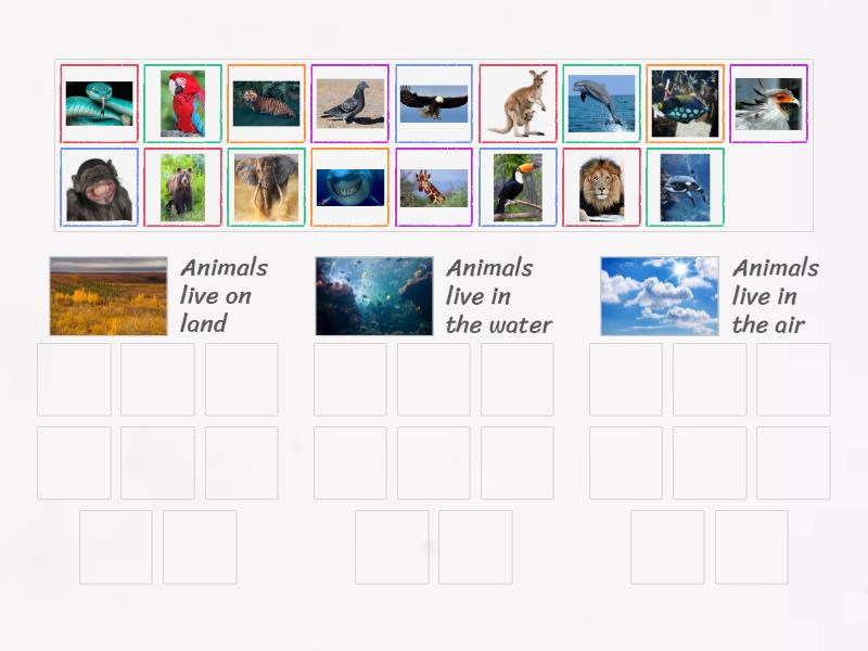 Animals live on land: , , , , , , , , Animals live in the water: , , , , Animals live in the air:  , , , , ,