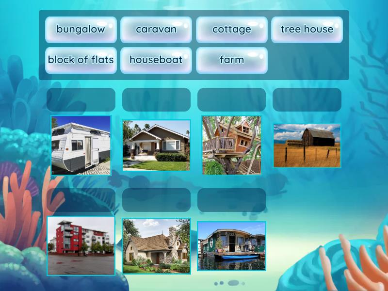 houseboat, cottage, bungalow, block of flats, tree house, farm, caravan,
