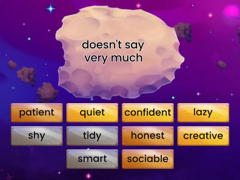 quiet - doesn't say very much, shy - is often nervous about speaking to people, sociable - enjoys being with other people, creative - has a lot of new ideas or is good at making things, tidy - likes everything to be in the right place, patient - doesn't mind when things take a long time, confident - is sure they can do things well, smart - is good at understanding things, honest - always tells the truth, lazy - doesn't like working,