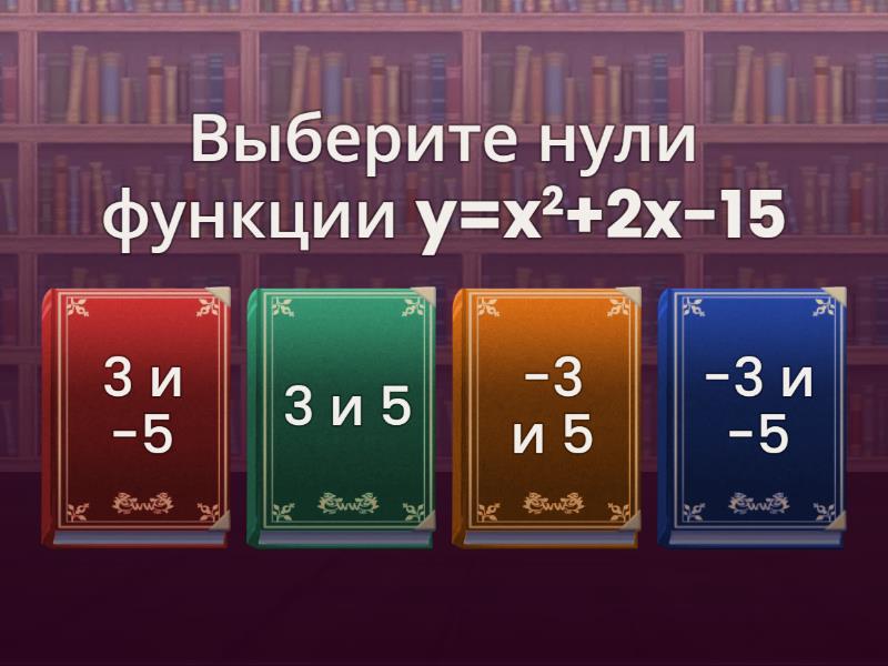 1) Выберите верные утверждения для функции y=x2-4x+3 a) D(f) = R b) D(f) = [-2;+∞) c) E(f) = R d) E(f) = [-2;+∞) e) E(f) = [-1;+∞) f) E(f) = (-∞;-1] 2) Выберите верные утверждения для функции y=-x2+6x+5 a) D(f) = R b) D(f) = [3;+∞) c) E(f) = R d) E(f) = (-∞;-14] e) E(f) = [14;+∞) f) E(f) = (-∞;14] 3) Выберите верные утверждения для функции y=x2+10x+11 a) не имеет наибольшего значения b) не имеет наименьшего значения c) yнаим=-5 d) yнаиб=-5 e) yнаим=-14 f) yнаиб=36 4) Выберите верные утверждения для функции y=-x2+2x-15 a) не имеет наибольшего значения b) не имеет наименьшего значения c) yнаим=-14 d) yнаиб=-14 e) yнаим=14 f) yнаиб=1 5) Выберите нули функции y=(x-1)(x+3) a) 1 и 3 b) -1 и -3 c) 1 и -3 d) -1 и 3 e) функция не имеет нулей 6) Выберите нули функции y=-(x+2)(x+8) a) 2 и 8 b) -2 и -8 c) 2 и -8 d) -2 и 8 e) функция не имеет нулей 7) Выберите нули функции y=x2+2x-15 a) 3 и 5 b) -3 и 5 c) -3 и -5 d) 3 и -5 8) Выберите нули функции y=x2+2x a) 0 b) 0 и 2 c) -2 и 0 d) -2 9) Выберите нули функции y=5x2 a) 0 b) 0 и 5 c) -5 и 0 d) -5 10) Выберите нули функции y=x2-4x+12 a) 2 и 6 b) -2 и 6 c) -6 и -2 d) -6 и 2 e) функция не имеет нулей