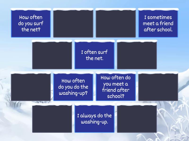 How often do you meet a friend after school? - I sometimes meet a friend after school., How often do you do the washing-up? - I always do the washing-up., How often do you surf the net? - I often surf the net., How often do you dust the furniture? - I don't often dust the furniture., How do you feel about watching a football match? - I can't stand watching football matches., How do you feel about going to parties? - I don't mind going to parties., Would you like to attend a concert after school? - I'd rather not.,