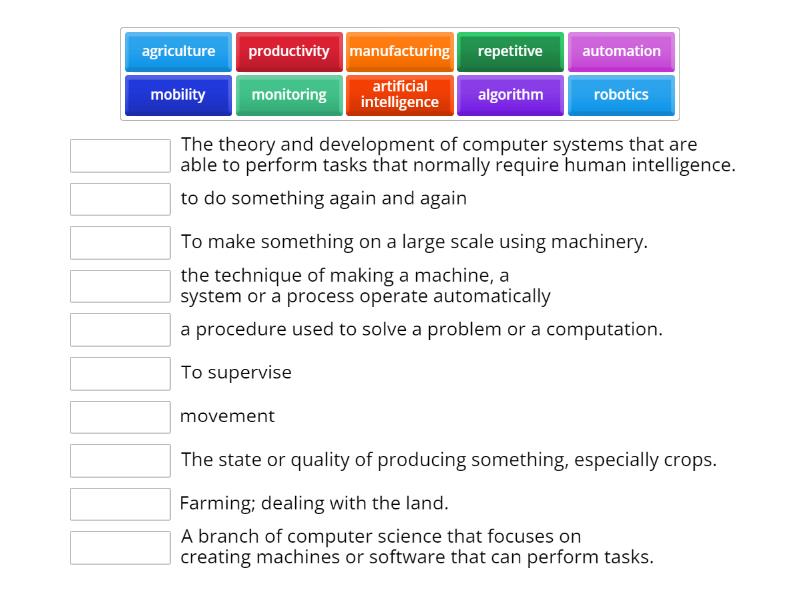 automation - the technique of making a machine, a system or a process operate automatically, algorithm - a procedure used to solve a problem or a computation., artificial intelligence - The theory and development of computer systems that are able to perform tasks that normally require human intelligence., robotics - A branch of computer science that focuses on creating machines or software that can perform tasks., agriculture - Farming; dealing with the land., manufacturing - To make something on a large scale using machinery., repetitive - to do something again and again, mobility - movement, productivity - The state or quality of producing something, especially crops., monitoring - To supervise,