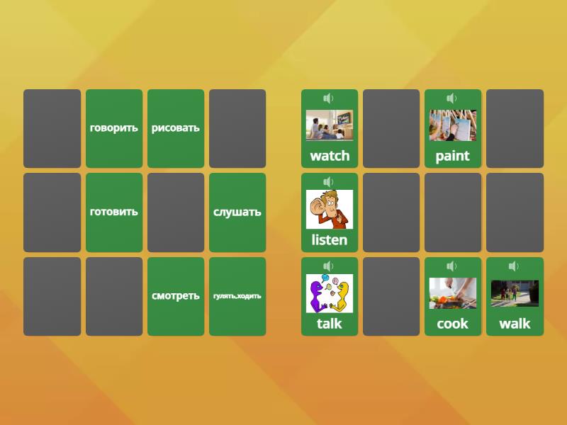 рисовать - paint, смотреть - watch, готовить - cook, гулять,ходить - walk, говорить - talk, слушать - listen, взбираться - climb, проходить - pass, смеяться - laugh, начинать - start, отдыхать - rest, мыть - wash,