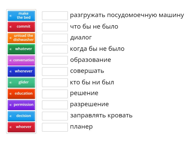 commit - совершать, unload the dishwasher - разгружать посудомоечную машину, make the bed - заправлять кровать, glider - планер, permission - разрешение, whoever - кто бы ни был, whatever - что бы не было, whenever - когда бы не было, education - образование, conversation - диалог, decision - решение,