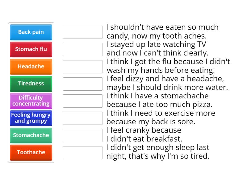 Stomachache - I think I have a stomachache because I ate too much pizza., Headache - I feel dizzy and have a headache, maybe I should drink more water., Tiredness - I didn't get enough sleep last night, that's why I'm so tired., Feeling hungry and grumpy - I feel cranky because I didn't eat breakfast., Back pain - I think I need to exercise more because my back is sore., Toothache - I shouldn't have eaten so much candy, now my tooth aches., Stomach flu - I think I got the flu because I didn't wash my hands before eating., Difficulty concentrating - I stayed up late watching TV and now I can't think clearly.,
