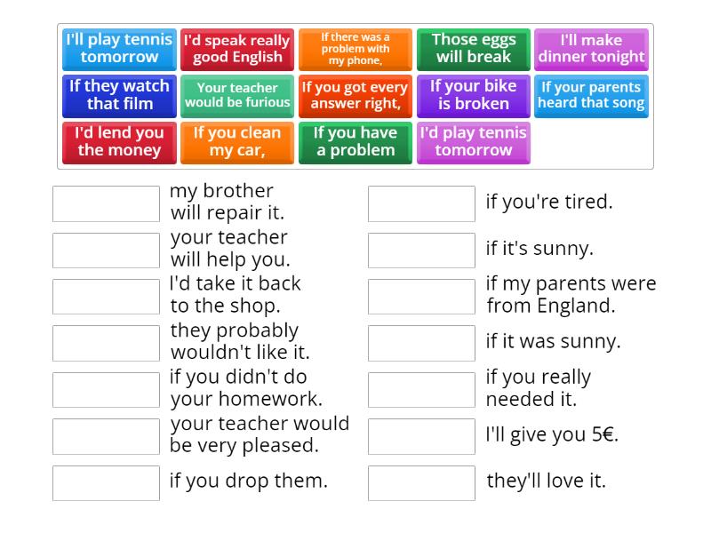 If there was a problem with my phone, - I'd take it back to the shop., If you clean my car, - I'll give you 5€., I'll make dinner tonight - if you're tired., If you got every answer right, - your teacher would be very pleased., If your parents heard that song - they probably wouldn't like it., I'd play tennis tomorrow - if it was sunny., I'd lend you the money - if you really needed it., Those eggs will break - if you drop them., Your teacher would be furious - if you didn't do your homework., If your bike is broken - my brother will repair it., If they watch that film - they'll love it., I'll play tennis tomorrow - if it's sunny., I'd speak really good English - if my parents were from England., If you have a problem - your teacher will help you.,