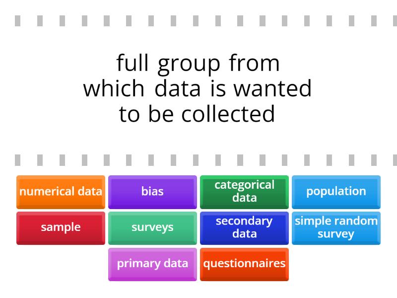 population - full group from which data is wanted to be collected, sample - subset of the population that is representative, numerical data - data with numbers, categorical data - data with categories or groups, primary data - data collected by the person or group that will use the information for themselves, secondary data - data collected by someone else or another group, or from the internet/newspapers, surveys - method of collecting data/information from a particular group and the results recorded, questionnaires - series of questions designed to get data from people or group, bias - when statistics don't provide an accurate representation of a population or if leading questions are used etc, simple random survey - every member of the population has the same chance of being chosen,
