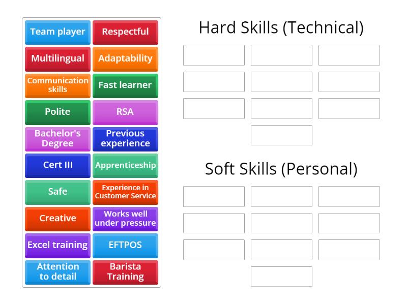 Hard Skills (Technical): Cert III, Experience in Customer Service, RSA, Multilingual, Barista Training, Bachelor's Degree, Previous experience, Apprenticeship , EFTPOS, Excel training, Soft Skills (Personal): Creative, Team player, Attention to detail, Adaptability, Respectful, Polite, Safe, Fast learner, Communication skills, Works well under pressure,