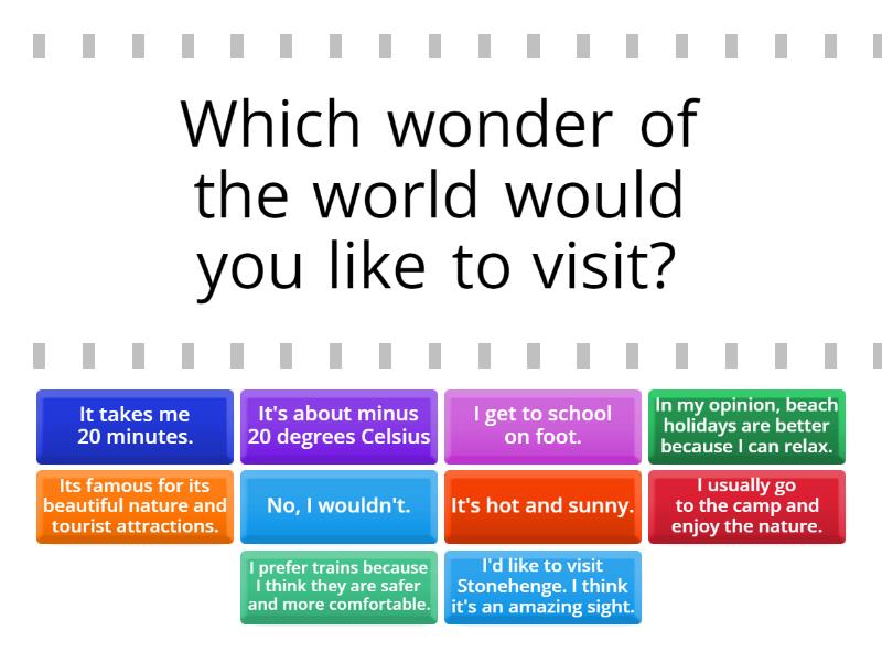 I'd like to visit Stonehenge. I think it's an amazing sight. - Which wonder of the world would you like to visit?, I usually go to the camp and enjoy the nature. - Where do you go on holiday?, Its famous for its beautiful nature and tourist attractions. - What is your area famous for?, In my opinion, beach holidays are better because I can relax. - What's better - guided tours or beach holidays?, I get to school on foot. - How do you get to school?, It takes me 20 minutes. - How long does it take you to get to school?, I prefer trains because I think they are safer and more comfortable. - Do you prefer fast cars or trains?, It's hot and sunny. - What's the weather like in your area in summer?, It's about minus 20 degrees Celsius - What's the average temperature in your area in winter?, No, I wouldn't. - Would you like to live in an exremely hot place?,