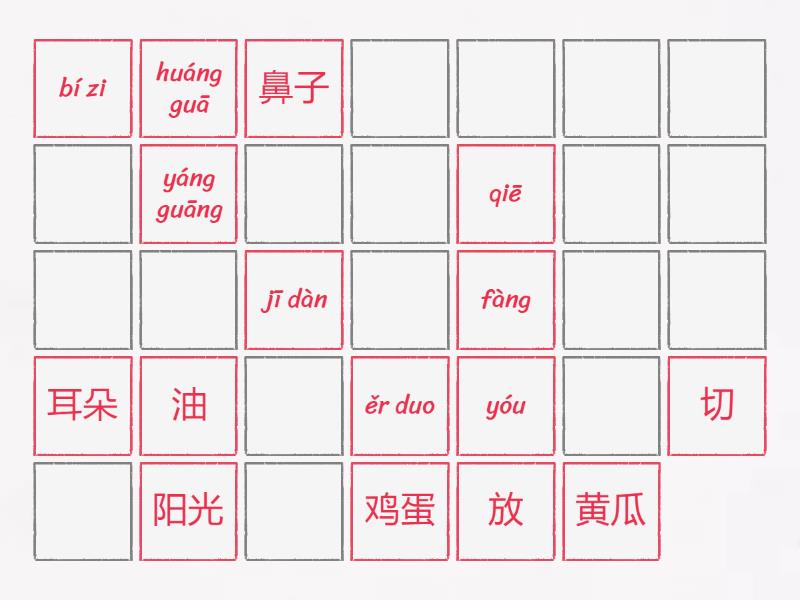 阳光 - yáng guāng, 黄瓜 - huáng guā, 鸡蛋 - jī dàn, 油 - yóu, 鼻子 - bí zi, 耳朵 - ěr duo, 放 - fàng, 切 - qiē, 庆祝 - qìng zhù, 兴奋 - xīng fèn, 安静 - ān jìng, 照顾 - zhào gù, 记得 - jì de, 送给 - sòng gěi, 懂事 - dǒng shì, 需要 - xū yào, 早餐 - zǎo cān,