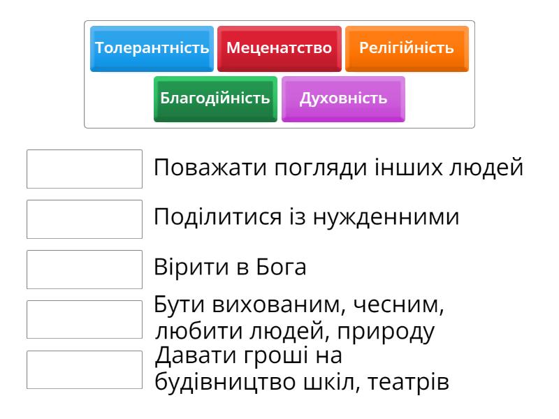 Релігійність - Вірити в Бога, Духовність - Бути вихованим, чесним, любити людей, природу, Благодійність - Поділитися із нужденними, Меценатство - Давати гроші на будівництво шкіл, театрів , Толерантність - Поважати погляди інших людей,