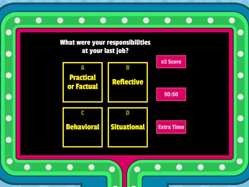 1) What were your responsibilities at your last job? a) Practical or Factual b) Reflective c) Behavioral d) Situational 2) Describe a time you weren't happy at work. a) Practical or Factual b) Reflective c) Behavioral d) Situational 3) What's your availability? a) Practical or Factual b) Reflective c) Behavioral d) Situational 4) What is your greatest strength? a) Practical or Factual b) Reflective c) Behavioral d) Situational 5) Tell me about yourself. a) Practical or Factual b) Reflective c) Behavioral d) Situational 6) What would you do if you had an aggressive customer? a) Practical or Factual b) Reflective c) Behavioral d) Situational 7) Tell me about a time you had to handle lot of stress. a) Practical or Factual b) Reflective c) Behavioral d) Situational 8) How would you prioritize if you worked for two departments? a) Practical or Factual b) Reflective c) Behavioral d) Situational 9) What changes would you make in your current job? a) Practical or Factual b) Reflective c) Behavioral d) Situational 10) What is your greatest weakness? a) Practical or Factual b) Reflective c) Behavioral d) Situational 11) Describe a time you had a problem with a coworker. a) Practical or Factual b) Reflective c) Behavioral d) Situational 12) What type of position are you looking for? a) Practical or Factual b) Reflective c) Behavioral d) Situational