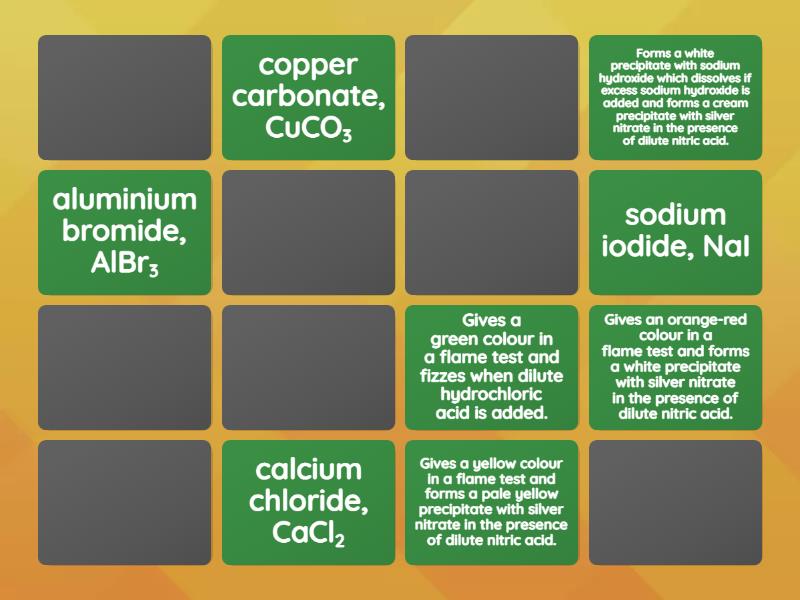 copper carbonate, CuCO3 - Gives a green colour in a flame test and fizzes when dilute hydrochloric acid is added., calcium chloride, CaCl2 - Gives an orange-red colour in a flame test and forms a white precipitate with silver nitrate in the presence of dilute nitric acid., aluminium bromide, AlBr3 - Forms a white precipitate with sodium hydroxide which dissolves if excess sodium hydroxide is added and forms a cream precipitate with silver nitrate in the presence of dilute nitric acid., sodium iodide, NaI - Gives a yellow colour in a flame test and forms a pale yellow precipitate with silver nitrate in the presence of dilute nitric acid., iron(II) carbonate, FeCO3 - Forms a green precipitate with sodium hydroxide and fizzes when dilute hydrochloric acid is added., copper(II) sulfate, CuSO4 - Forms a blue precipitate with sodium hydroxide and forms a white precipitate with barium chloride in the presence of dilute hydrochloric acid., potassium carbonate, K2CO3 - Gives a lilac colour in a flame test and fizzes when dilute hydrochloric acid is added., iron(III) sulfate, Fe2(SO4)3 - Forms a brown precipitate with sodium hydroxide and forms a white precipitate with barium chloride in the presence of dilute hydrochloric acid.,