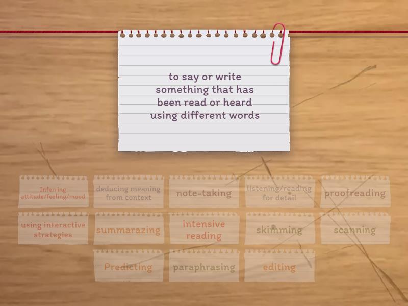 paraphrasing - to say or write something that has been read or heard using different words, Inferring attitude/feeling/mood - to decide how a writer or speaker feels about something from the way that they speak or write., Predicting - To use clues like headlines or pictures or general knowledge about the text or topic to make it easier to understand what you read or hear, deducing meaning from context - To guess the meaning of an unknown word by using the information in a situation, proofreading - To read a text to check if there are any mistakes in spelling, grammar, punctuation, etc., scanning - to read a text quickly to pick out specific information, e.g. finding a phone number in a phone book, using interactive strategies - to use strategies when speaking to keep people involved and interested in what is said or to keep communication going, e.g. eye contact,, summarazing - to take out the main points of a long text, and rewrite or retell them in a short, clear way, listening/reading for detail - To listen to or read a text in to understand most of what it says or particular information. , note-taking - to listen and write down ideas from the text in short form, skimming - To read a text quickly to get a general idea of what it is about, intensive reading - to read or listen and to focus on how language is used in a text, editing - To shorten or change or correct the words or content of some parts of a written text to make it clearer or easier to understand.  ,