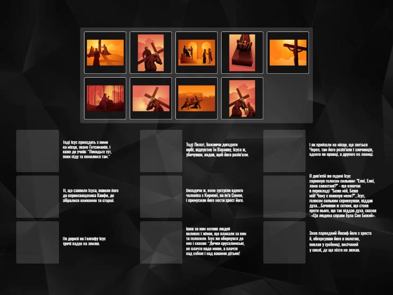 Тоді Ісус приходить з ними на місце, зване Гетсиманія, і каже до учнів: “Посидьте тут, поки піду та помолюся там.”, Ті, що схопили Ісуса, повели його до первосвященика Каяфи, де зібралися книжники та старші., По дорозі на Голгофу Ісус тричі падає на землю., Тоді Пилат, бажаючи догодити юрбі, відпустив їм Варавву, Ісуса ж, убичувши, видав, щоб його розіп'яли., Виходячи ж, вони зустріли одного чоловіка з Киринеї, на ім'я Симон, і примусили його нести хрест його., Ішов за ним натовп людей великих і жінок, що плакали за ним та голосили. Ісус же обернувся до них і сказав: “Дочки єрусалимські, не плачте надо мною, а плачте над собою і над вашими дітьми!, І як прийшли на місце, що зветься Череп, там його розіп'яли і злочинців, одного по правці, а другого по левиці., О дев'ятій же годині Ісус скрикнув голосом сильним: "Елої, Елої, лама савахтані?" - що означає в перекладі: "Боже мій, Боже мій! Чому є покинув мене?"...Ісус, голосом сильним скрикнувши, віддав духа....Бачивши ж сотник, що стояв проти нього, що так віддав духа, сказав : «Ця людина справи була Син Божий»., Зняв парведний Йосиф його з хреста й, обгорнувши його в полотно, поклав у гробниці, висічений у скелі, де ще ніхто не лежав.,