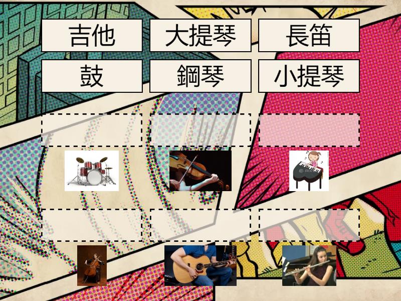 鋼琴, 長笛, 鼓, 吉他, 小提琴, 大提琴,