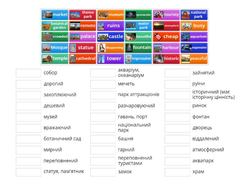 botanical garden - ботаничний сад, aquarium - акваріум, океанаріум, market - ринок, theme park - парк аттракціонів, Mosque - мечеть, temple - храм, castle - замок, cathedral - собор, fountain - фонтан, harbour - гавань, порт, museum - музей, national park - національний парк, palace - дворець, ruins - руїни, statue - статуя, пам'ятник, tower - башня, water park - аквапарк, atmospheric - атмосферний, beautiful - гарний, disappointing - разчаровуючий, peaceful - мирний, busy - зайнятий, crowded - переповнений, cheap - дешевий, expensive - дорогий, historic - історичний (має історічну цінність), impressive - вражаючий, remote - віддалений, spectacular - захоплюючий, touristy - переповнений туристами,