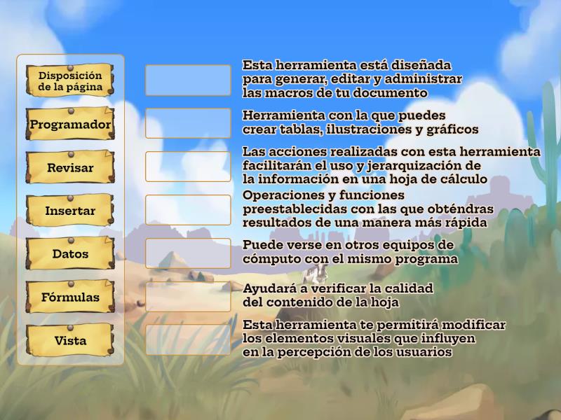 Insertar - Herramienta con la que puedes crear tablas, ilustraciones y gráficos , Disposición de la página - Puede verse en otros equipos de cómputo con el mismo programa, Fórmulas - Operaciones y funciones preestablecidas con las que obténdras resultados de una manera más rápida, Datos - Las acciones realizadas con esta herramienta facilitarán el uso y jerarquización de la información en una hoja de cálculo, Revisar - Ayudará a verificar la calidad del contenido de la hoja , Vista - Esta herramienta te permitirá modificar los elementos visuales que influyen en la percepción de los usuarios, Programador - Esta herramienta está diseñada para generar, editar y administrar las macros de tu documento ,