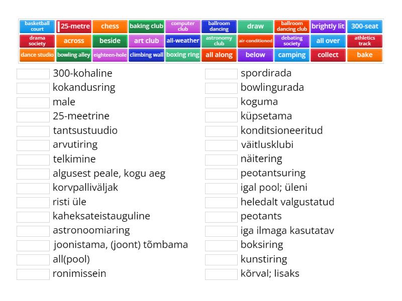 25-metre - 25-meetrine, 300-seat - 300-kohaline, across - risti üle, air-conditioned - konditsioneeritud, all along - algusest peale, kogu aeg, all over - igal pool; üleni, all-weather - iga ilmaga kasutatav, art club - kunstiring, astronomy club - astronoomiaring, athletics track - spordirada, bake - küpsetama, baking club - kokandusring, ballroom dancing - peotants , ballroom dancing club - peotantsuring, basketball court - korvpalliväljak, below - all(pool), beside - kõrval; lisaks, bowling alley - bowlingurada, boxing ring - boksiring, brightly lit - heledalt valgustatud, camping - telkimine, chess - male, climbing wall - ronimissein, collect - koguma, computer club - arvutiring, dance studio - tantsustuudio, debating society - väitlusklubi, drama society - näitering, draw - joonistama, (joont) tõmbama, eighteen-hole - kaheksateistauguline,