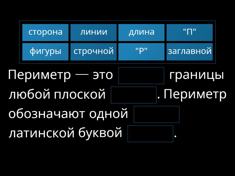 Периметр — это ____ границы любой плоской ____. Периметр обозначают одной ____ латинской буквой ____. Периметр многоугольника — это ____ длин всех его ____. Чтобы найти периметр любого многоугольника, нужно ____ длины всех его сторон.