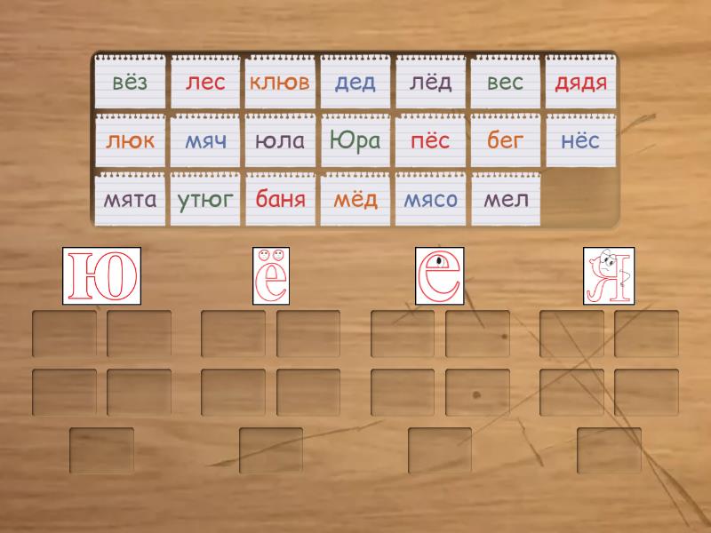 : люк, клюв, Юра, юла, утюг, : лёд, мёд, пёс, нёс, вёз, : мел, лес, вес, дед, бег, : мяч, мясо, мята, баня, дядя,