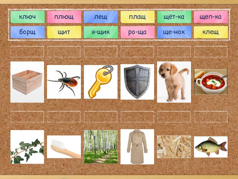 лещ, щит, щёт-ка, плющ, ключ, плащ, щеп-ка, ще-нок, борщ, клещ, я-щик, ро-ща,