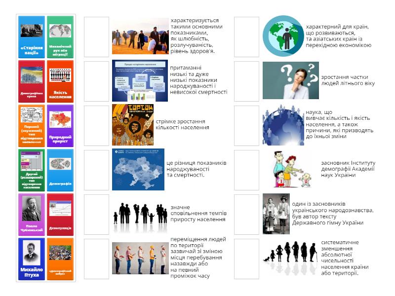 Природний приріст - це різниця показників народжуваності та смертності., Депопуляція - систематичне зменшення абсолютної чисельності населення країни або території., «Старіння нації» - зростання частки людей літнього віку, Механічний рух або міграції - переміщення людей по території зазвичай зі зміною місця перебування назавжди або на певний проміжок часу, Якість населення - характеризується такими основними показниками, як шлюбність, розлучуваність, рівень здоров’я., Демографія - наука, що вивчає кількість і якість населення, а також причини, які призводять до їхньої зміни, Павло Чубинський - один із засновників українського народознавства, був автор тексту Державного гімну України, Михайло Птуха - засновник Інституту демографії Академії наук України, «Демографічний вибух» - стрімке зростання кількості населення, Демографічна криза - значне сповільнення темпів приросту населення, Перший (звужений) тип відтворення населення - притаманні низькі та дуже низькі показники народжуваності і невисокої смертності, Другий (розширений) тип відтворення населення - характерний для країн, що розвиваються, та азіатських країн із перехідною економікою,