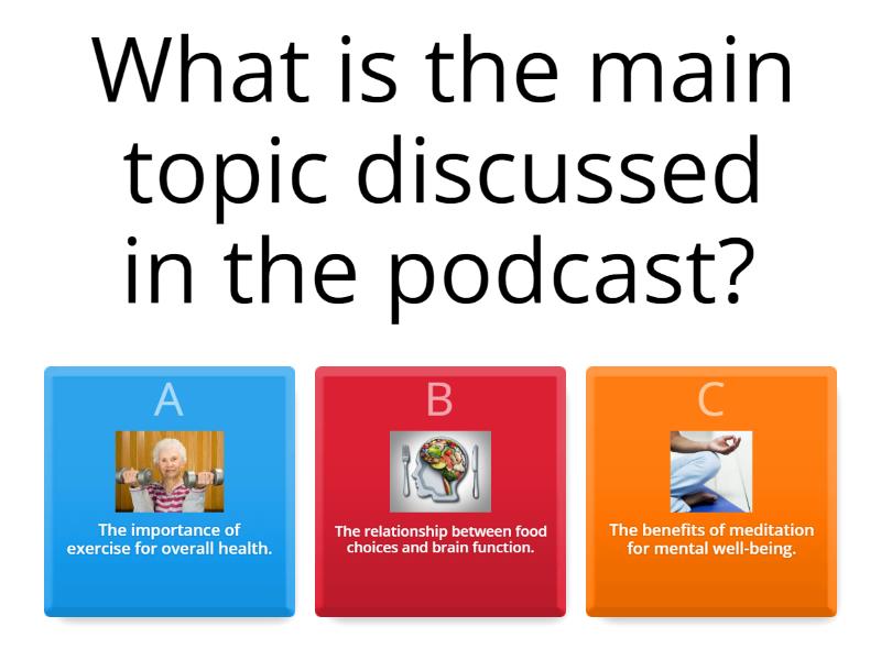 1) What is the main topic discussed in the podcast? a) The importance of exercise for overall health. b) The relationship between food choices and brain function. c) The benefits of meditation for mental well-being. 2) Which food is highlighted as a brain-boosting superfood? a) French fries. b) Microwave-ready meals. c) Wild-caught Alaskan salmon. 3) What analogy does Dr. Reeta Achari use to emphasize the importance of maintaining a balanced diet for brain health? a) Comparing the brain to a car. b) Comparing the brain to a computer. c) Comparing the brain to a plant. 4) What picture best shows the meaning of: SUGAR RUSH a) b) c) 5) What picture best shows the meaning of: BALANCED DIET a) b) c) 6) What picture best shows the meaning of: GO LOW a) b) c) 7) What picture best shows the meaning of: BATCH COOK a) b) c) 8) What picture best shows the meaning of: 20 MINUTES FLAT a) b) c)