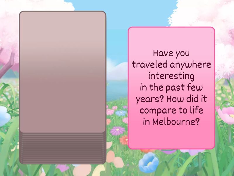 Where are you from? How big is your family?, What's one technology or app that has significantly changed your life in the past few years?, Do you have a guilty pleasure? What is it?, What's one memorable experience you've had while using public transportation in Melbourne?, What is it that you miss the most about your home country?, Have you traveled anywhere interesting in the past few years? How did it compare to life in Melbourne?, Where did you live as a child? What was the neighborhood like?, What's one movie, TV show, or book from the past few years that has left a lasting impression on you?, Have you attended any major events or festivals in Melbourne recently? Which one was your favorite?, What's your favourite season of the year? Why?, What's the most exciting aspect of learning a new language?, What's the most difficult aspect of learning English?, Where do you live now? Can you describe your current neighborhood? , How much does it take you to get to ILSC? Do you use the same transport every day?, Have you encountered any unique or unexpected phenomena (cultural, weather) specific to Melbourne?, What do you usually do on a free day?, Are you into sports? if so, which kinds?, Do you have any hobbies? Singing, dancing, gaming, etc., What's a restaurant you would recommend in Melbourne?, Do you have any pets?, How many languages do you know?, Do you like Melbourne?, What's your job?, What's your favourite meal to cook?, What's the most challenging part of your job?, How long have you been in Melbourne?, How old are you?, What is a TV show you loved and binged?, What are your plans this weekend?, What do you do when you need an energy boost?, Do you have any hidden talents people don't know about?, Where do you live in Melbourne?.