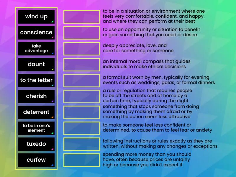 daunt - to make someone feel less confident or determined, to cause them to feel fear or anxiety, to the letter - following instructions or rules exactly as they are written, without making any changes or exceptions, conscience - an internal moral compass that guides individuals to make ethical decisions, cherish - deeply appreciate, love, and care for something or someone, to be in one’s element - to be in a situation or environment where one feels very comfortable, confident, and happy, and where they can perform at their best, wind up - spending more money than you should have, often because prices are unfairly high or because you didn't expect it, tuxedo - a formal suit worn by men, typically for evening events such as weddings, galas, or formal dinners, curfew - a rule or regulation that requires people to be off the streets and at home by a certain time, typically during the night, deterrent - something that stops someone from doing something by making them afraid or by making the action seem less attractive, take advantage - to use an opportunity or situation to benefit or gain something that you need or desire.,