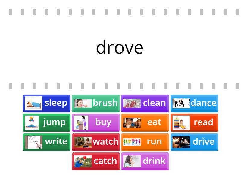drive - drove, watch - watched, run - ran, jump - jumped, drink - drank, sleep - slept, brush - brushed, read - read, clean - cleaned, dance - danced, catch - caught, eat - ate, write - wrote, buy - bought,