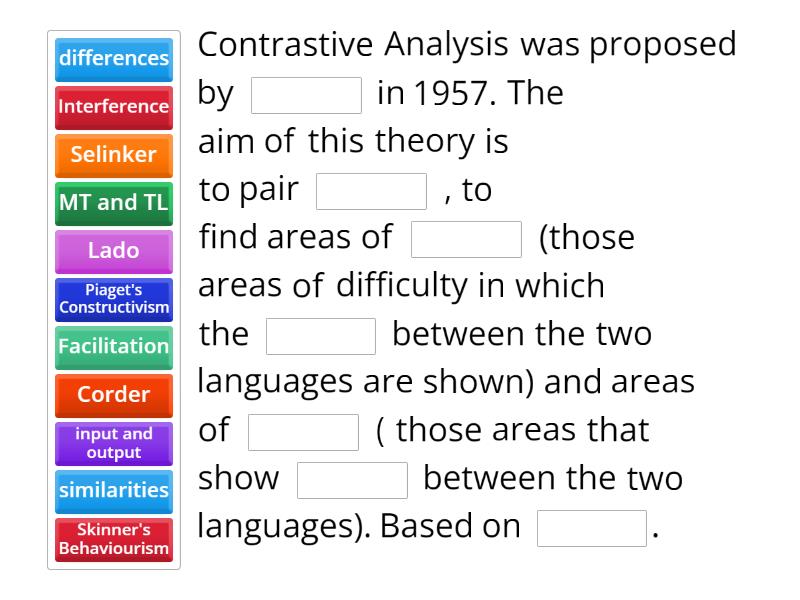 Contrastive Analysis was proposed by ____ in 1957. The aim of this theory is to pair ____ , to find areas of ____ (those areas of difficulty in which the ____ between the two languages are shown) and areas of ____ ( those areas that show ____ between the two languages). Based on ____. The implications for teaching following Contrastive Analysis: The teacher could predict a ____ ; The teacher would already know which areas would be ____ for students. ____ makes perfect. DRAWBACKS it didn’t predict some ____ that actually emerge in SL Learning it predicted errors that ____ , it was ____ approach for multiple L1 background classrooms/courses Error Analysis was proposed by ____ in 1967. Language is seen as an ____. Individuals play ____ role in the building of a system. Its main focus are ____ which are windows into the language learner’s ____ ; they show the learner’s ____ of language. EA analyzed and classified SLLs’ errors: ____ *She love music. ____ *I have 10 years old. Drawbacks? ____ in classification Lack of ____ data Potential for avoidance Interlanguage was proposed by ____ in 1972. • IL system develops in a continuum towards the ____ • The stages of development are a series of ____ systems that characterize the learner’s progress over time. ____ is a central notion in IL theory. It refers to the ____ made to ____ as a result of ____ . Changes show a ____ difference between one stage and the previous one. If learning is restructured, it means the system changes certain rules due to the ____ of new information that is ____ into the existing ones. Restructuring of the SLL’s system results in the creation of a (slightly) new second language system; a new interim grammar. INTERLANGUAGE (SELINKER, 1972) is : 1. ____ : The system of rules which learners have in their minds changes frequently, or is in a state of flux, resulting in a succession of interim grammars. 2. ____ : At any point of development, the IL is governed by rules that constitute the learner’s internal grammar. 3. ____ : Although the IL is systematic, differences in context result in different patterns of language use. 4. ____ : in form and function: It has less complex grammatical structures than the TL; It has a smaller range of communicative needs than the TL.