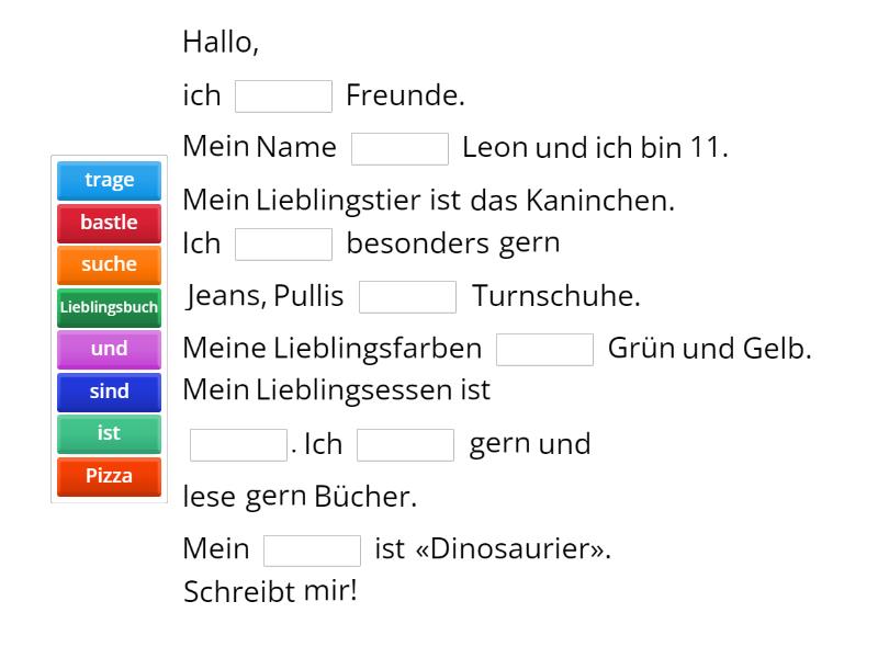Hallo, ich ____ Freunde. Mein Name ____ Leon und ich bin 11. Mein Lieblingstier ist das Kaninchen. Ich ____ besonders gern Jeans, Pullis ____ Turnschuhe. Meine Lieblingsfarben ____ Grün und Gelb. Mein Lieblingsessen ist ____. Ich ____ gern und lese gern Bücher. Mein ____ ist «Dinosaurier». Schreibt mir!
