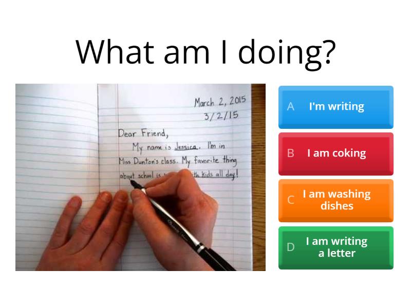 1) This is Sarah. What is Sarah doing? a) Sarah is eating pizza b) Sarah is eating chips c) Sarah is sleeping  d) Sarah is watching TV 2) What are the children doing? a)  The children are playing soccer b) They're planting c) They're playing d) He's planting 3) True or False: I'm not studying math now. a) True b) False 4) What is he doing? a) He's washing dishes  b) He is washing his car c) He is cheking his e-mails d) He washing his car 5) What is she doing?  a) She is playing with her son b) She is drinking water  c) She's drinking wine  d) She's drinking tea  6) What am I doing? a) I'm writing b) I am coking c) I am washing dishes d) I am writing a letter 7) What are the dog and the little girl doing? a) They are sleeping b) The dog is eating and the girl is sleeping c) They're drinking water d) They're cooking 8) Am I studying or reading a book? a) You are studying b) You are reading a book 9) True or False: The little boy is crying a) True b) False 10) True or False: He isn't taking pictures a) True b) False
