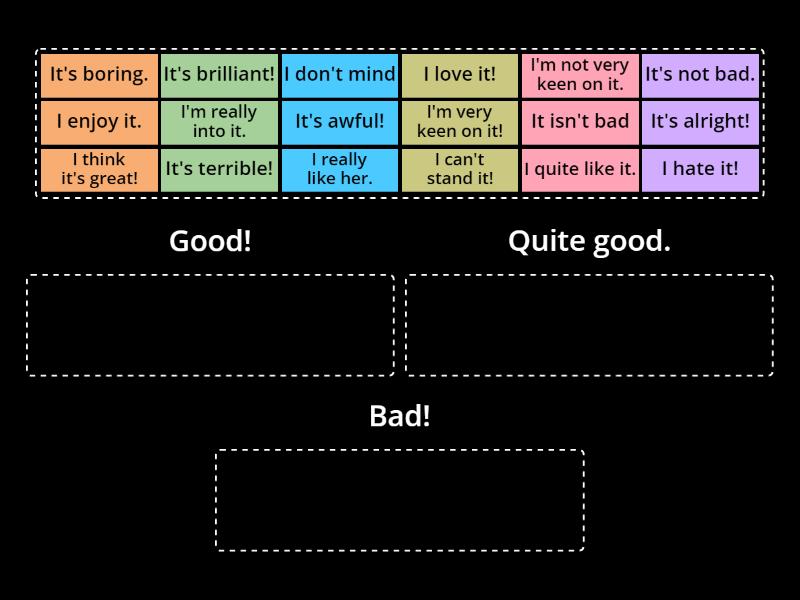 Good!: I love it!, I think it's great!, I'm very keen on it!, It's brilliant!, I'm really into it., I really like her., Quite good.: It's alright!, I enjoy it., I quite like it., It's not bad., I don't mind, It isn't bad, Bad!: It's terrible!, I can't stand it!, I hate it!, It's awful!, I'm not very keen on it., It's boring. ,