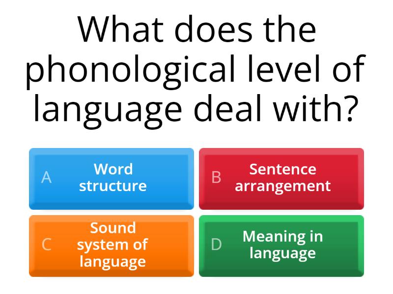 1) What does the phonological level of language deal with? a) Word structure b) Sentence arrangement c) Sound system of language d) Meaning in language 2) Which of the following demonstrates a phonological distinction? a) The plural form of "cats" in English b) The contrast between /p/ and /b/ in "pat" and "bat" c) The difference between "run" and "running" d) The word order in "The dog chases the cat" 3) What is morphology concerned with? a) Word arrangement b) Word structure and formation c) Sentence meaning d) Sound patterns 4) Which of the following is an example of morphological strategy? a) Adding "-s" or "-es" for plurals b) Subject-verb-object (SVO) word order c) The contrast between /p/ and /b/ d) Using indirect speech acts like requests 5) What does syntax focus on? a) Sentence arrangement b) Sound patterns c) Word meanings d) Sentence arrangementWord meanings 6) Which level of language involves the study of meaning? a) Pragmatic b) Morphological c) Syntactic d) Semantic 7) What is the main role of semantics in language? a) To facilitate effective communication b) To convey information and represent the world c) To create new words d) To establish patterns of sound combinations 8) Which level of language examines how language is used in context to achieve communicative goals? a) Semantic b) Syntactic c) Pragmatic d) Phonological 9) What is the main function of comparison across language levels? a) To identify similarities and differences b) To create new words c) To establish grammatical rules d) To convey information