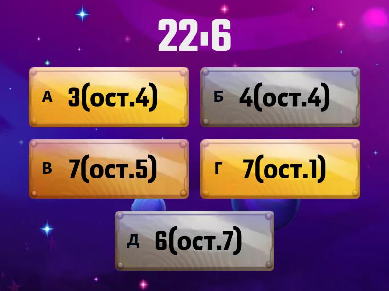 1) 22:6 a) 3(ост.4) b) 4(ост.4) c) 7(ост.5) d) 7(ост.1) e) 6(ост.7) 2) 32:7 a) 3(ост.5) b) 4(ост.4) c) 7(ост.1) d) 7(ост.5) e) 6(ост.7) 3) 46:6 a) 3(ост.5) b) 7(ост.1) c) 7(ост.4) d) 6(ост.7) e) 4(ост.4) 4) 29:4 a) 4(ост.4) b) 6(ост.7) c) 7(ост.1) d) 7(ост.5) e) 3(ост.5) 5) 37:8 a) 4(ост.5) b) 5(ост.2) c) 4(ост.1) d) 3(ост.7) e) 6(ост.2) 6) 47:7 a) 5(ост.6) b) 6(ост.5) c) 7(ост.5) d) 5(ост.7) e) 7(ост.2) 7) 103:5 a) 20(ост.3) b) 21(ост.1) c) 50(ост.2) d) 20(ост.5)