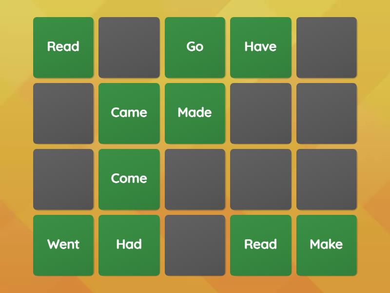 Come - Came, Go - Went, Have - Had, Make - Made, Read - Read, Say - Said, See - Saw, Stand - Stood, Think - Thought, Wear - Wore,