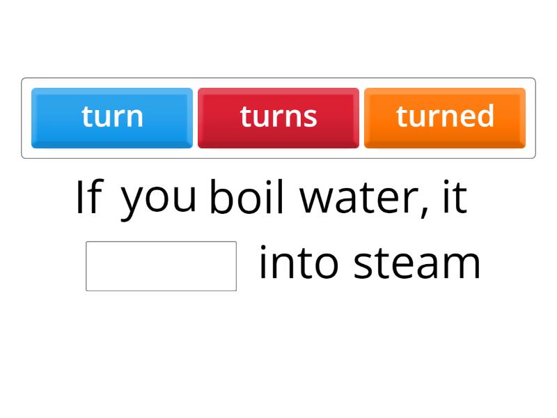 If you boil water, it ____ into steam If you ____ ice, it melts If you heat water to 100 degrees Celsius, it ____. If you do not keep the ice cream in the freezer, it ____. If you ____ water, it ____ into ice. If you ____ ice, it turns into water. If you don't ____, you are ____. If you ____, you pass the exam. If you ____ yellow and red, you get ____. If you don't sleep, you ____ get up early. If you touch ____, you ____ burned. If you ____ in the rain, you get ____. If you ____ a glass on the floor, it ____ If babies hungry, they ____ If it ____ rain, the plants ____ grow