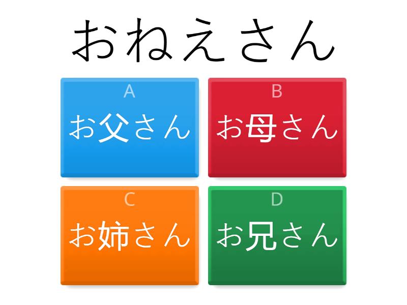 1) おねえさん a) お父さん b) お母さん c) お姉さん d) お兄さん 2) お兄さん a) おとうさん b) おかあさん c) おねえさん d) おにいさん 3) いもうと a) 母 b) 弟 c) 妹 d) 姉 4) おとうと a) 弟 b) 父 c) 兄 d) 母 5) しまい a) 父母 b) 姉妹 c) 妹姉 d) 兄弟 6) 兄弟 a) きょうだい b) きょだい c) しまい d) しめい 7) 好き a) たき b) さき c) すき d) てき 8) 母子 a) ふし b) ふこ c) ぼし d) はこ