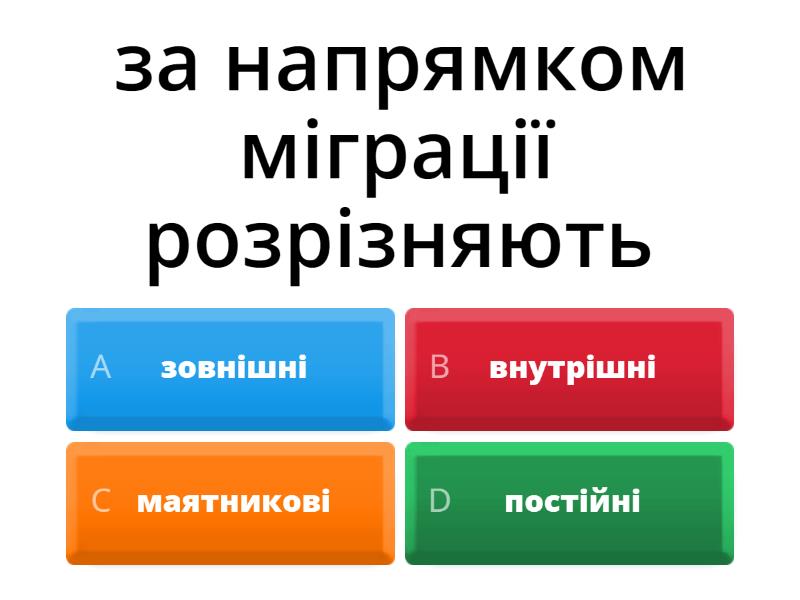 1) за напрямком міграції розрізняють a) зовнішні b) внутрішні c) маятникові d) постійні 2) за термінами міграції розрізняють a) внутрішні b) сезонні c) тимчасові d) постійні 3) за масовістю міграції розрізняють a) сезонні b) одиничні c) масові d) внутрішні 4) за дальністю міграції розрізняють a) масові b) міжконтинентальні c) внутрішньоконтинентальні d) постійні 5) за мотивами міграції розрізняють a) примусові b) міжконтинентальні c) внутрішньоконтинентальні d) добровільні 6) за способами організації міграції розрізняють a) міжконтинентальні b) організовані c) неорганізовані d) добровільні 7) за правовим статусом міграції розрізняють a) міжконтинентальні b) легальні c) нелегальні d) сезонні 8) за причинами міграції розрізняють a) релігійні b) економічні c) політичні d) примусові 9) великі центри іміграції a) Англо-Америка b) Західна Європа c) нафтодобувні країни Пд.-Зх.Азії d) Африка 10) країни з високими показниками іміграції a) США b) Індія c) Канада d) Німеччина 11) країни з високими показниками еміграції a) США b) Індія c) Пакістан d) Мексика 12) механічний рух населення a) еміграція b) іміграція c) народжуваність d) смертність