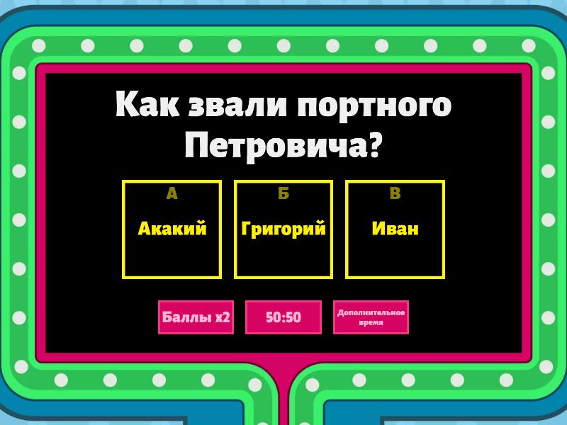 1) Как звали портного Петровича? a) Акакий b) Григорий c) Иван 2) Сколько денег откладывал Акакий Акакиевич, чтобы скопить вторую половину денег на шинель? a) по одному рублю b) не откладывал c) по грошу с каждого потраченного рубля 3) Что случилось с Башмачкиным после вечера у столоначальника? a) пошел в кабак b) он встретил друга c) его ограбили 4) Как ведет себя призрак Башмачкина? a) Он срывает с прохожих шинели. b) Он пугает прохожих c) Он охраняет переулки 5) Какой чин носит Акакий Акакиевич? a) титулярный советник b) статский советник c) губернский секретарь 6) Основная тема повести "Шинель" a) тема города b) Тема "маленького человека" c) тема добра и зла