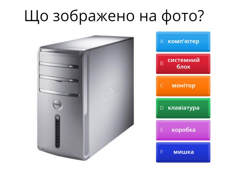 1) Що зображено на фото? a) комп'ютер b) системний блок c) монітор d) клавіатура e) коробка f) мишка 2) Що зображено на фото? a) монітор b) екран c) системний блок d) телевізор e) дошка f) планшет 3) Що зображено на фото? a) Мишка b) Навушники c) Джойстик d) обруч e) колонка f) мікрофон 4) Що зображено на фото? a) принтер b) сканер c) клавіатура d) дошка e) кнопки f) монітор 5) Що зображено на фото? a) сканер b) принтер c) модем d) камера e) колонки f) навушники 6) Що зображено на фото? a) фото b) модем c) мишка d) мишеня e) мікрофон f) колонка 7) Що зображено на фото? a) годинник b) системний блок c) колонка d) монітор e) мікрофон f) комп'ютер