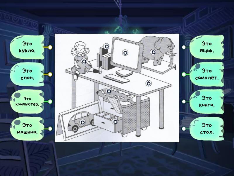 Это компьютер., Это книга., Это кукла., Это стол., Это машина., Это самолёт., Это ящик., Это слон..