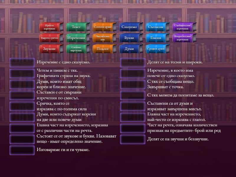 Изречения - Съставени са от думи и изразяват завършена мисъл., Въпросителни изречения - С тях можем да попитаме за нещо., Съобщителни изречения - С тях се съобщава нещо. Завършват с точка., Звукове - Изговаряме ги и ги чуваме., Букви - Четем и пишем с тях. Графичната страна на звука., Думи - Състоят се от звукове и букви. Назовават нещо - имат определено значение., Гласни - Делят се на тесни и широки., Съгласни - Делят се на звучни и беззвучни., Ударена сричка - Сричка, която се изразява с по-голяма сила, Текст - Съставен е от свързани изречения по смисъл., Сродни думи - Думи, които имат общ корен и близко значение., Сложни думи - Думи, които съдържат корени на две или повече думи, Сказуемо - Главна част на изречението, най-често се изразява с глагол., Подлог - Главна част на изречението, изразява се с различни части на речта., Просто изречение - Изречение с едно сказуемо., Сложно изречение - Изречение, в което има повече от едно сказуемо., Числително име - Част на речта, означава количествен признак на предметите- брой или ред,