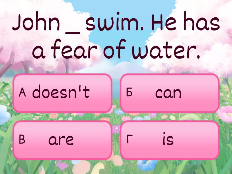 1) John _ swim. He has a fear of water. a) doesn't  b) can c) are d) is 2) This is my fish. _ name is Goldfish a) Its b) My c) You d) Their 3) _ are my roller-skates  a) These b) This c) It d) I 4) Kenny is _ than his classmates a) more clever b) cleverer c) the most clever d) cleverest 5) This is Mary and _ sister, Sue a) your b) mine c) she d) her 6) The radio is _ the bed a) behind b) on c) under d) next to 7) The phone is _ the table a) from b) behind c) under d) next to 8) Are you _ the floor now? a) mop b) mopped c) mops d) mopping 9) It's _ winter in my life a) the most cold b) cold c) the coldest d) colder 10) How does your sister dance? a) She can't dance b) She dance beautifully c) She dances beautiful d) She dances beautifully