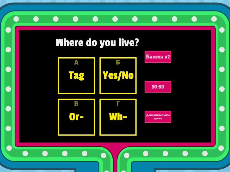 1) Where do you live? a) Tag b) Yes/No c) Or- d) Wh- 2) He is your favourite writer, isn't he? a) Or- b) Wh- c) Yes/No d) Tag 3) Have you seen this film? a) Yes/No b) Or- c) Tag d) Wh- 4) Was it a horror film or an action film? a) Tag b) Yes/No c) Wh- d) Or- 5) Why are they watching it again? a) Or- b) Yes/No c) Wh-2 d) Tag 6) She hasn't read Harry Potter, has she? a) Yes/No b) Wh- c) Or- d) Tag 7) Did you like ''Star Wars''? a) Or- b) Tag c) Wh- d) Yes/No 8) Does your brother like reading detective stories or science-fiction? a) Or- b) Wh- c) Tag d) Yes/No 9) When does the film start? a) Yes/No b) Wh- c) Tag d) Or- 10) You will check this information, won't you? a) Wh- b) Yes/No c) Tag d) Or- 11) Was the film boring? a) Wh- b) Tag c) Yes/No d) Or- 12) Did John prefer a book or a film? a) Or- b) Wh- c) Tag d) Yes/No 13) How many pages have you read? a) Or- b) Tag c) Wh- d) Yes/No 14) They went to the school of magic, didn't they? a) Tag b) Wh- c) Or- d) Yes/No 15) Are you going to read this again?! a) Wh- b) Tag c) Yes/No d) Or- 16) Are Stephen King's stories terrible or exciting? a) Tag b) Wh- c) Yes/No d) Or- 17) What is this film about? a) Wh- b) Or- c) Tag d) Yes/No