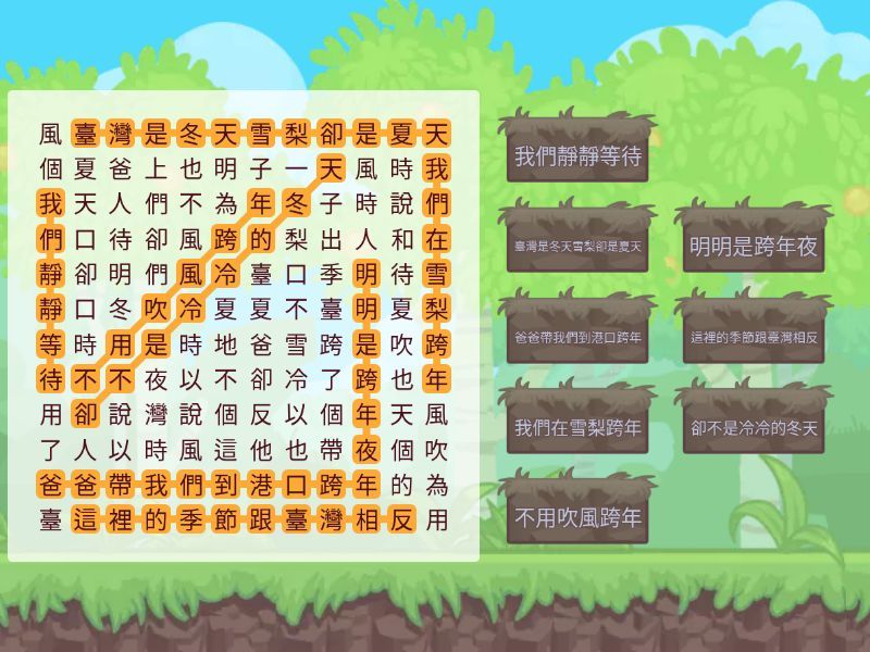 爸爸帶我們到港口跨年 - 爸爸帶我們到港口跨年, 我們在雪梨跨年 - 我們在雪梨跨年, 明明是跨年夜 - 明明是跨年夜, 卻不是冷冷的冬天 - 卻不是冷冷的冬天, 這裡的季節跟臺灣相反 - 這裡的季節跟臺灣相反, 臺灣是冬天雪梨卻是夏天 - 臺灣是冬天雪梨卻是夏天, 不用吹風跨年 - 不用吹風跨年, 我們靜靜等待 - 我們靜靜等待,